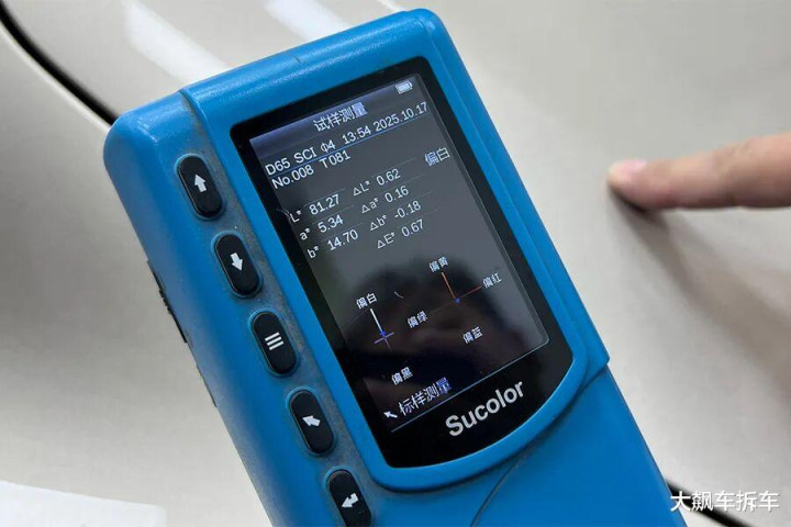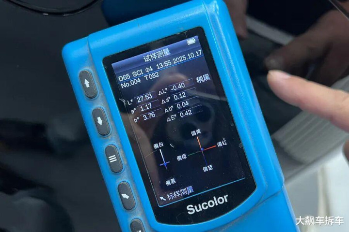 测试方法:使用色差计取基准数值。在车身其它位置进行对比测量,记录数值最大的位置。车身测试采样点不小于100个。