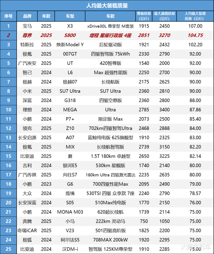 我们这辆车的整备质量为2851千克,最大满载质量为3270千克,因为这辆车是四座车型,所以计算得出,这辆2025款尊界增程星耀行政版4座的人均最大装载质量为104.75千克,超出标准29.75公斤。