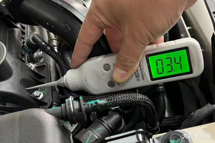 测试方法:水温正常后,关掉空调,在怠速状态下,使用测振仪垂直曲轴方向,将探针接触发动机金属机体中间的最高位置,测量发动机振动加速度值,数值越低,表明振动越小。